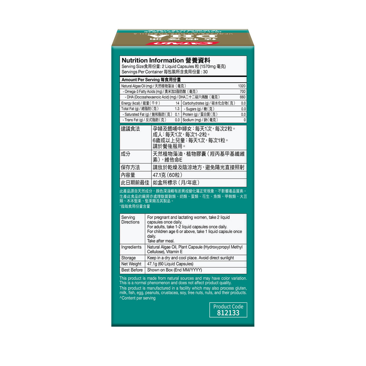 Natural Algae Oil, Plant Capsule (Hydroxypropyl Methyl Cellulose), Vitamin E