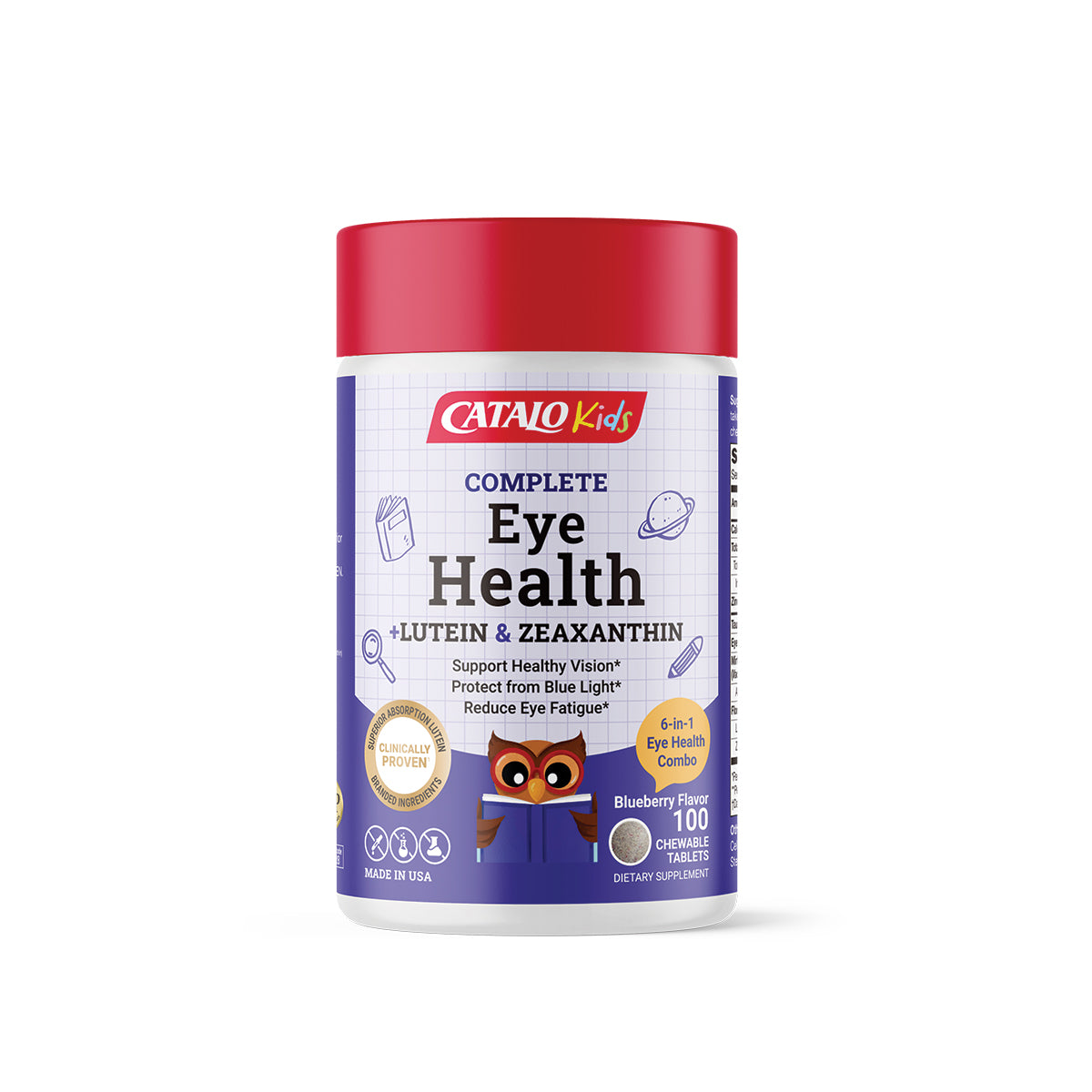 果糖、全脂奶粉、抗結劑(微晶纖維素)、獨特全效兒童護眼配方(天然牛磺酸、天然小米草精華、Mirtoselect®北歐野生藍莓精華、FloraGLO®萬壽菊精華、整合鋅寡糖複合物)、調味料(天然香草)、抗結劑(植物硬脂酸)、酸度調節劑(檸檬酸)、抗結劑(硬脂酸鎂、二氧化矽)、甜菊葉精華。
